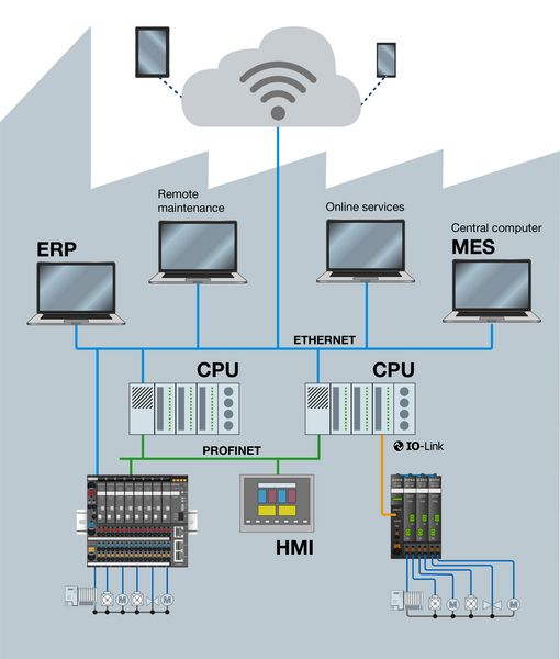 ControlPlex®DINrail 系统配有总线控制器 CPC20PN 和 EM12D-T、模块化配电系统模块 18plus、REX12D-T 和 ESX60D,能完美地满足这些要求。总线控制器的接口保证了能完美连接上级系统。PROFINET 或者 IO-Link 接口将配电系统与现场层面连接在一起,继而和连接的 CPU 及 HMI 相连接。