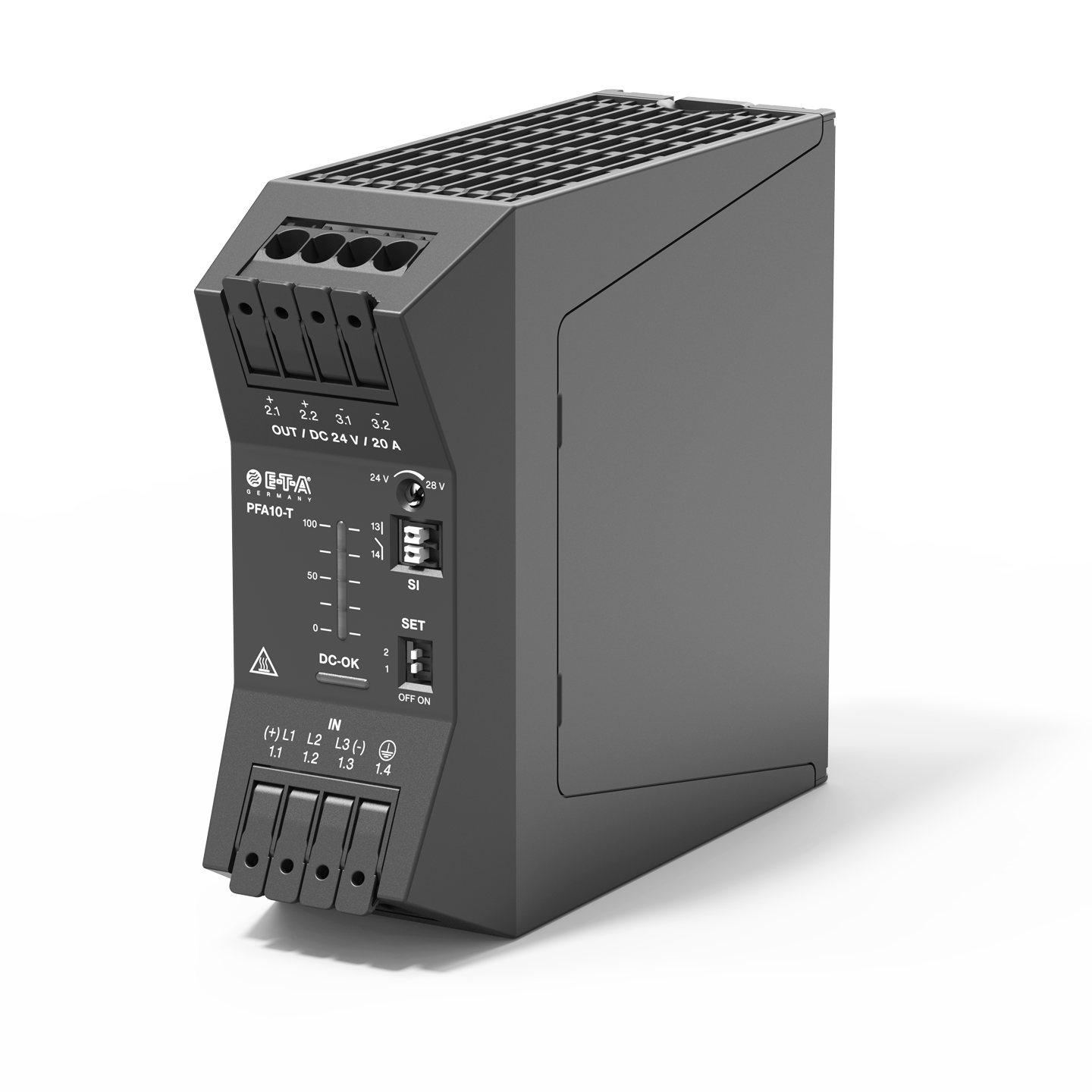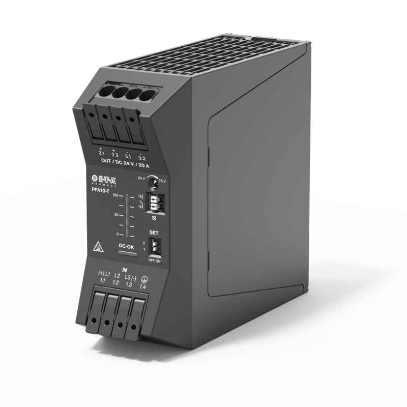 PFA10-T 初级脉冲式开关电源是自动化及机械工程应用的理想选择。其紧凑型设计可实现控制柜内的空间优化集成。配备 25°倾斜连接口的壳体支持无工具安装与快速更换。三相交流输入接口同样适用于直流电压操作模式。该电源提供直流 24V 输出,最高 95.3% 的效率系数,480W 输出功率以及持续 7.5 秒的 150% 功率储备,完全满足动态工业应用的所有需求。