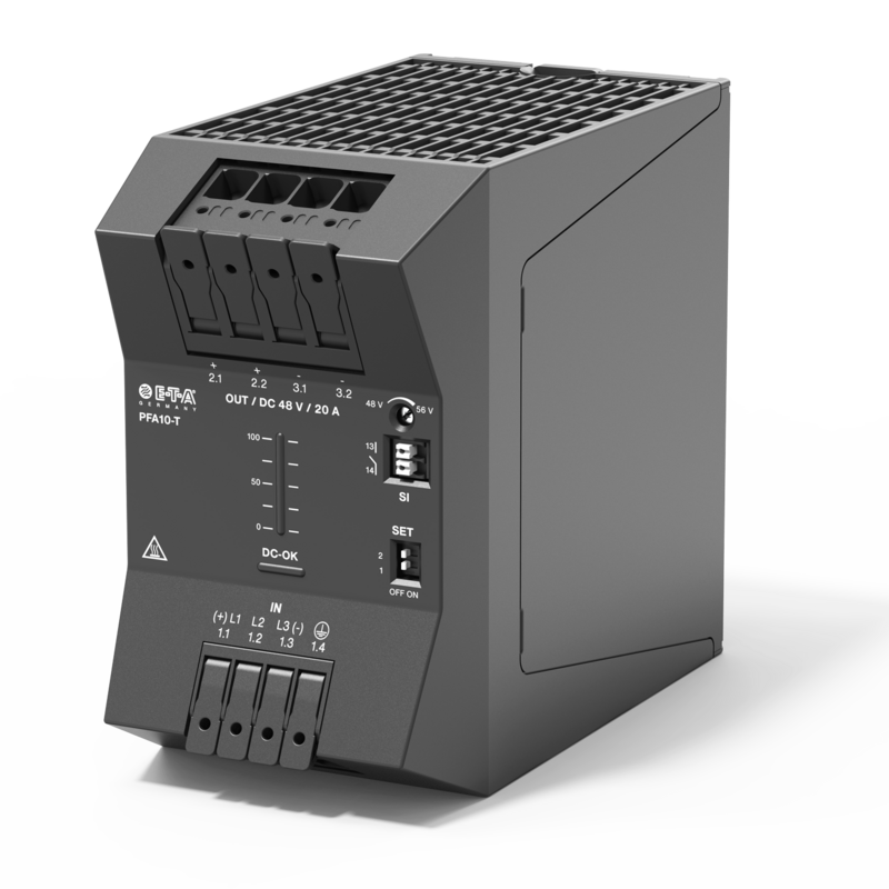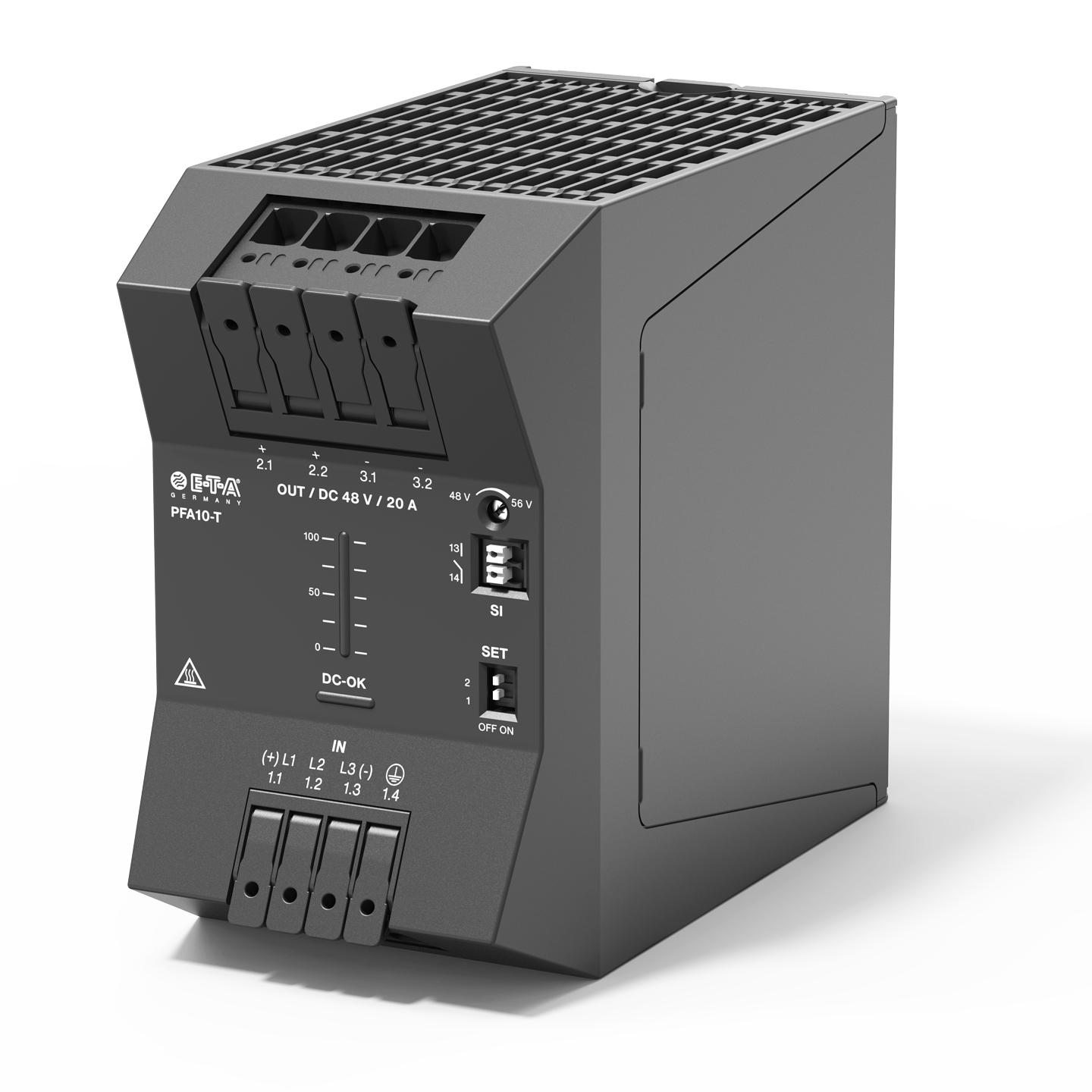 PFA10-T 初级脉冲式开关电源是自动化及机械工程应用的理想选择。其紧凑型设计可实现控制柜内的空间优化集成。配备 25°倾斜连接口的壳体支持无工具安装与快速更换。三相交流输入接口同样适用于直流电压操作模式。该电源提供直流 48V 输出,最高 97.1% 的效率系数,960W 输出功率以及持续 6 秒的 150% 功率储备,完全满足动态工业应用的所有需求。